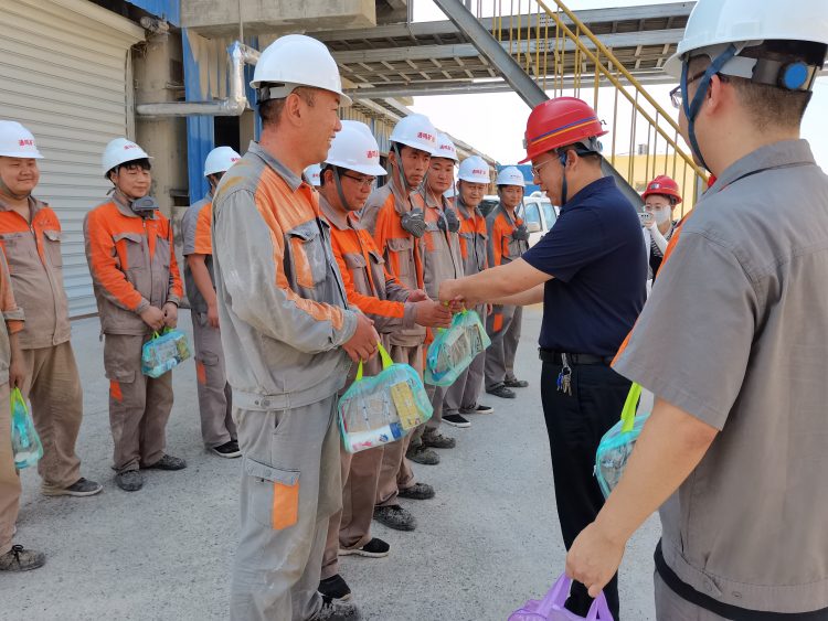 張立哲同志一行來到項(xiàng)目現(xiàn)場(chǎng),為一線工人送上香皂、洗發(fā)水、花露水等慰問品,保障高溫條件下一線員工的安全和健康。張立哲同志還與工友們進(jìn)行了親切交談,詳細(xì)了解通鳴礦業(yè)二期建設(shè)的進(jìn)展情況及大家在高溫天氣下的作息時(shí)間、工作情況等。