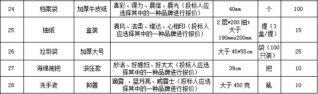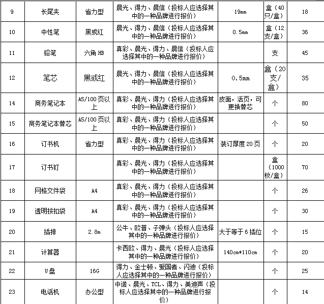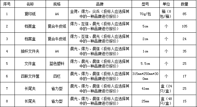 | 招標范圍 | 包括但不限于辦公用品的生產供貨、包裝、運輸、檢測、驗收、質保及售后服務等。如有漏項或缺項,投標人承擔全部責任。 | |||||||||