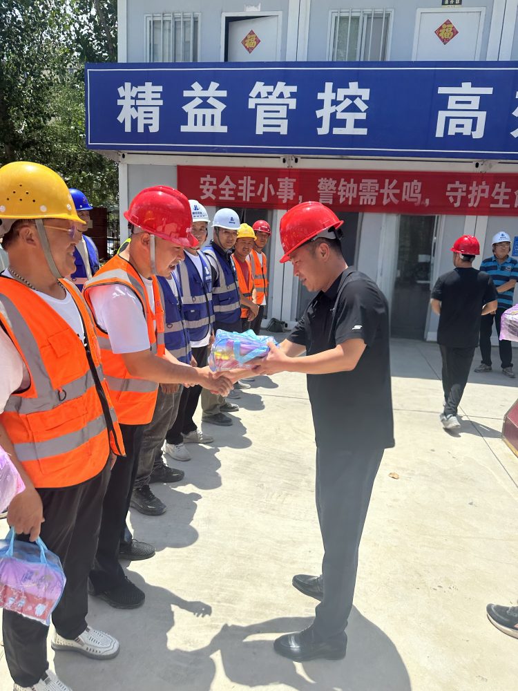 在項(xiàng)目現(xiàn)場,趙焱將防暑降溫物資送到一線施工人員手中,對他們在高溫環(huán)境下堅(jiān)守崗位、辛勤付出表示感謝,同時叮囑大家要注意防暑降溫,確保自身安全與健康。